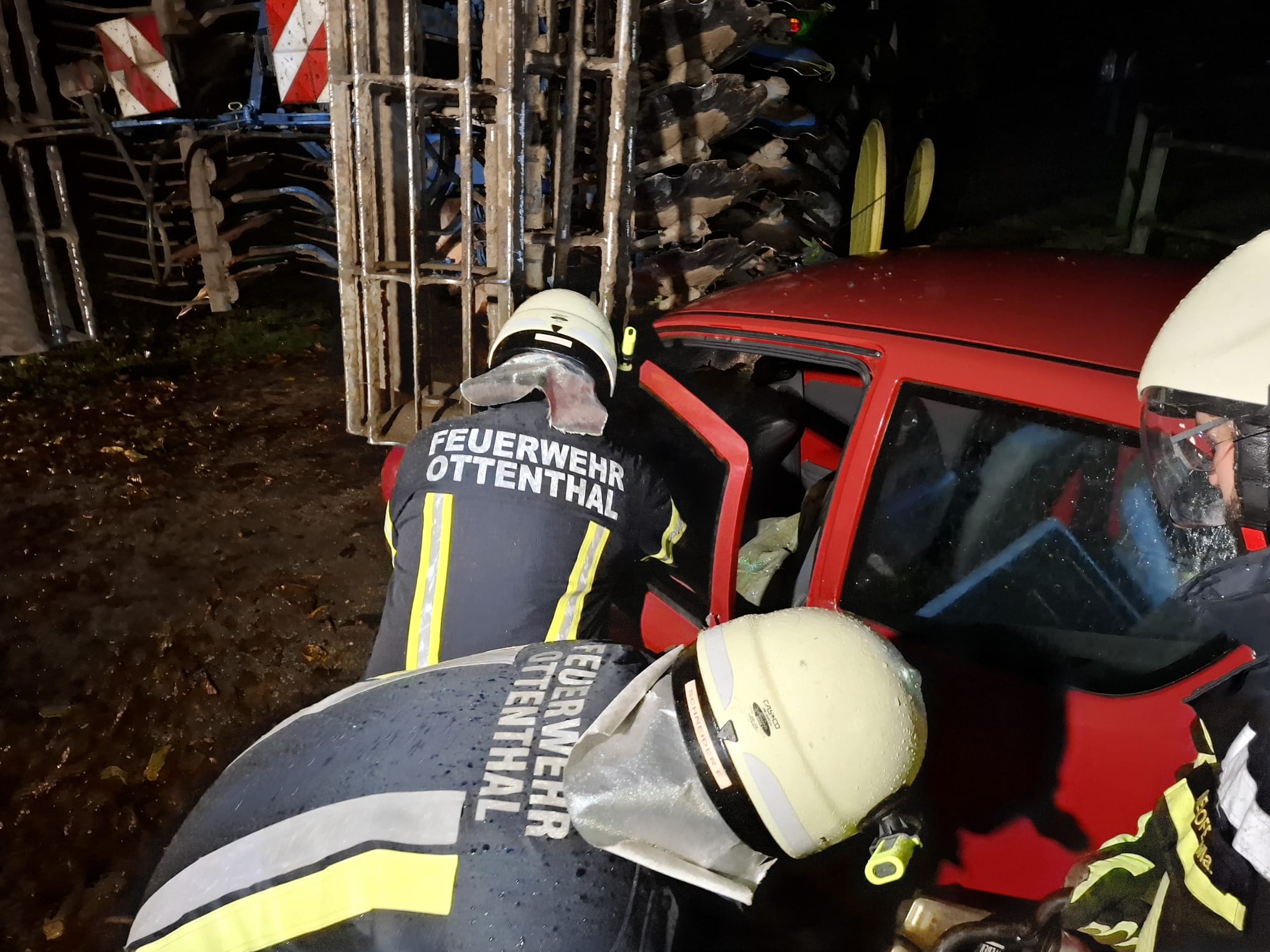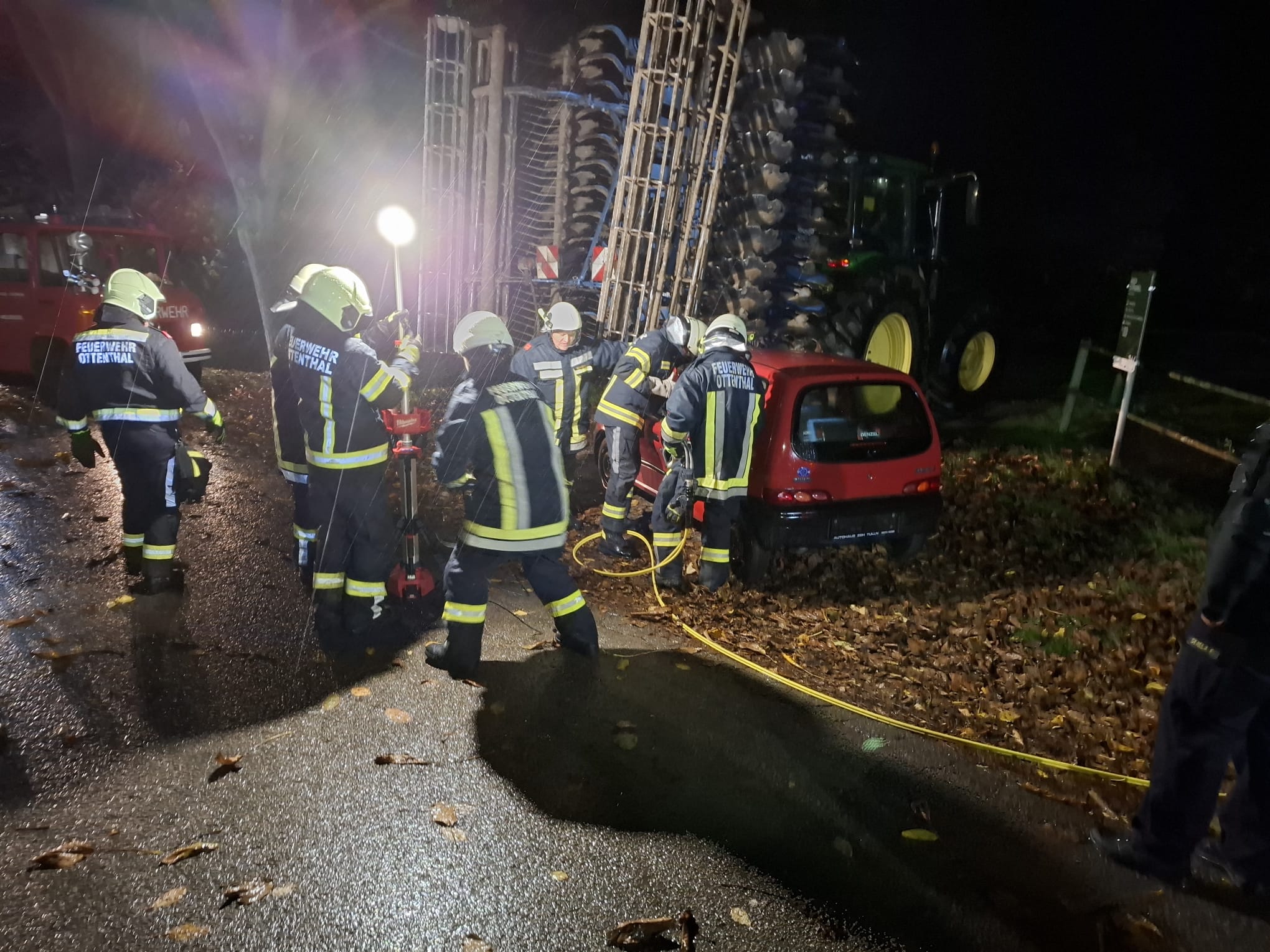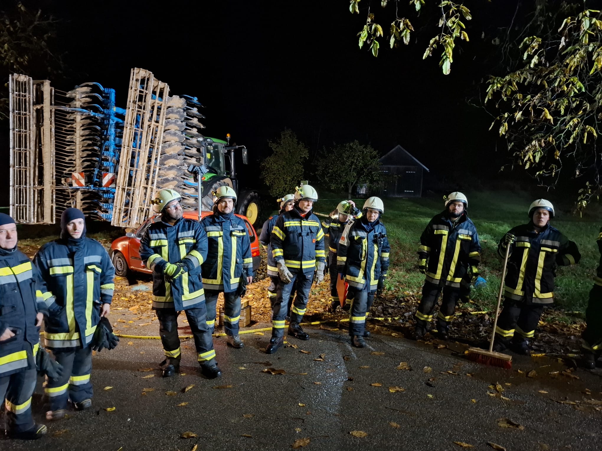 Übungsannahme war ein Kellerbrand mit vermisster Person, zusätzlich kam es zu einem Verkehrsunfall, bei dem ein Fahrzeug gegen eine Landmaschine prallte. Trotz des schlechten Wetters verlief die Übung sehr erfolgreich