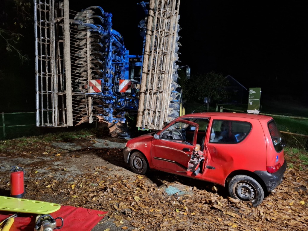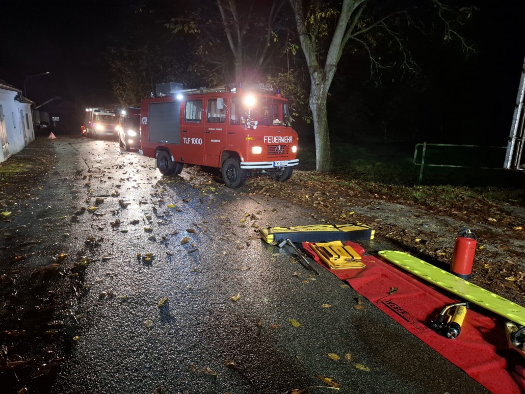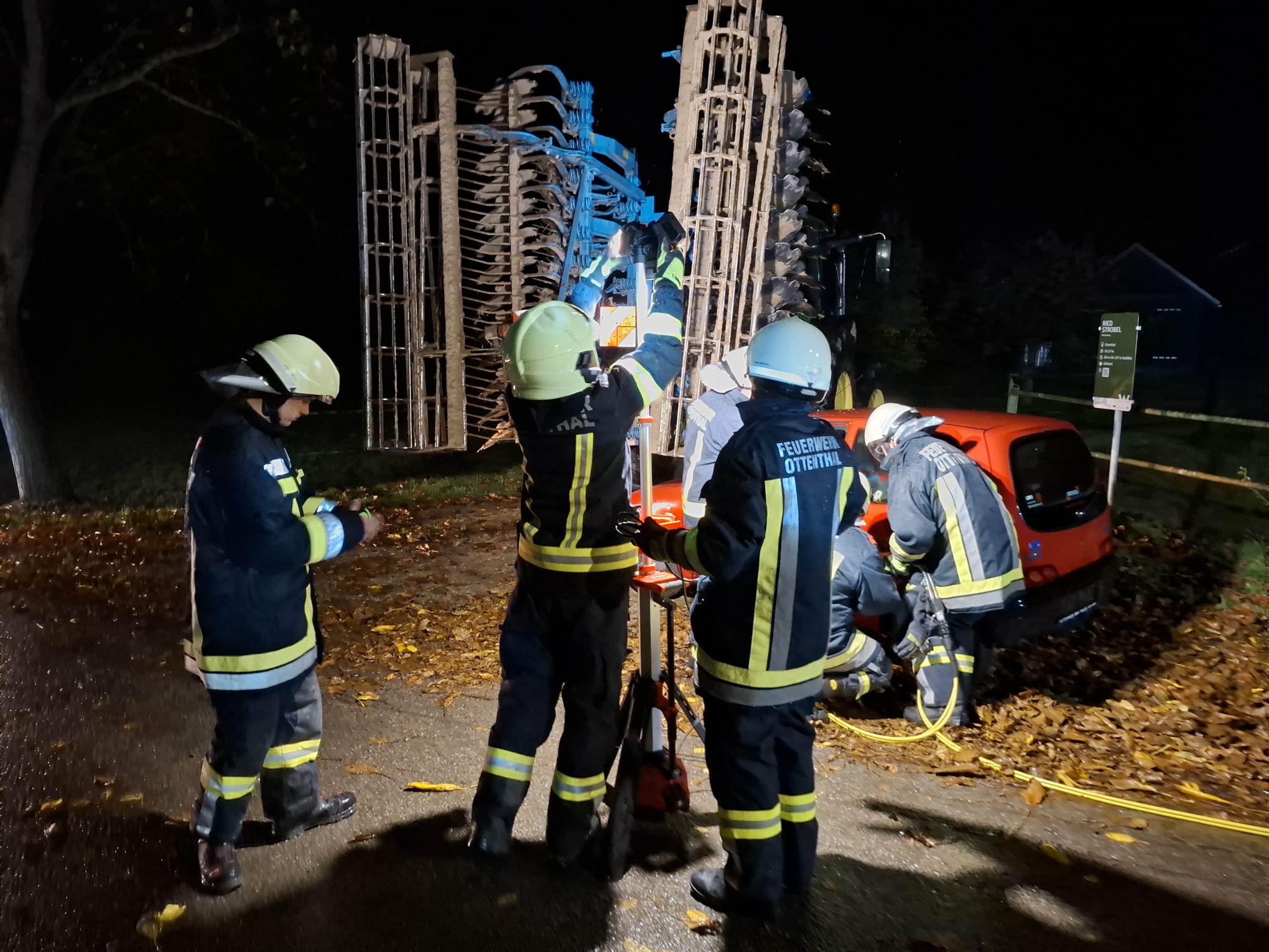 Übungsannahme war ein Kellerbrand mit vermisster Person, zusätzlich kam es zu einem Verkehrsunfall, bei dem ein Fahrzeug gegen eine Landmaschine prallte. Trotz des schlechten Wetters verlief die Übung sehr erfolgreich