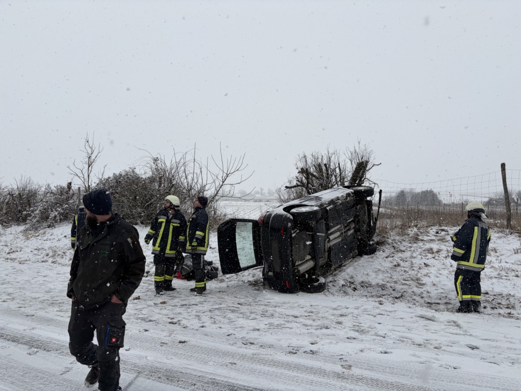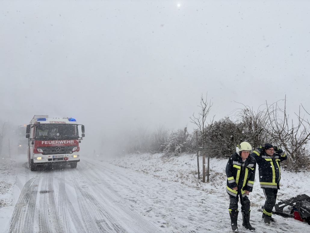 Kurze Zeit zuvor setzte sehr starker Schneefall ein, wodurch die Straßen trotz Winterdienst in kürzester Zeit extrem rutschig wurden. Der Fahrer des PKW konnte das Fahrzeug nicht mehr rechtzeitig zum Stehen bringen und kollidierte mit einer Böschung sowie einem kleinen Baum. Dabei drehte sich das Auto seitlich und blieb in dieser Position liegen.