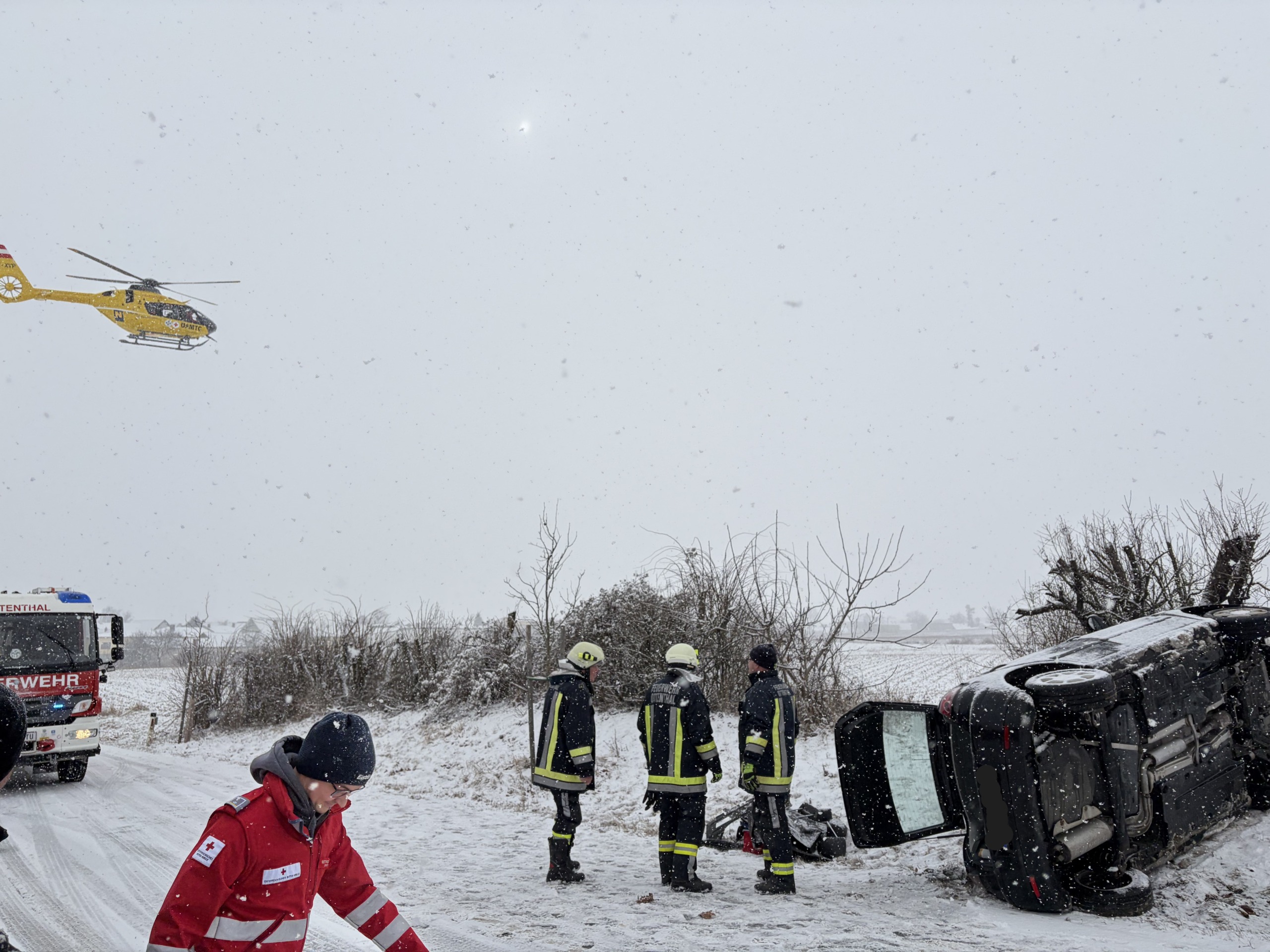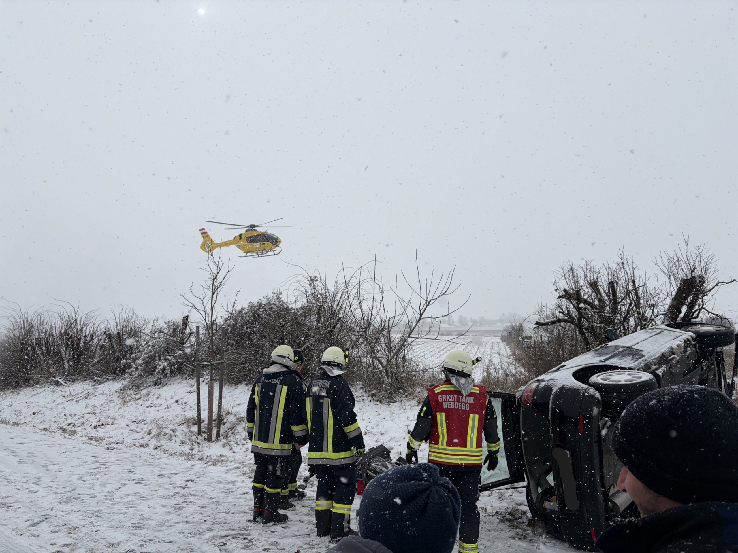 Die Insassen konnten sich selbst aus dem Fahrzeug befreien und wurden vom Roten Kreuz betreut. Gott sei Dank ist jedoch niemand verletzt worden. Aufgrund der Schadenslage wurde zusätzlich der Hubschrauber Christophorus 2 mitalarmiert. Nach der Landung und einem kurzen Lagebericht startete der Hubschrauber wieder in Richtung des nächsten Einsatzes.